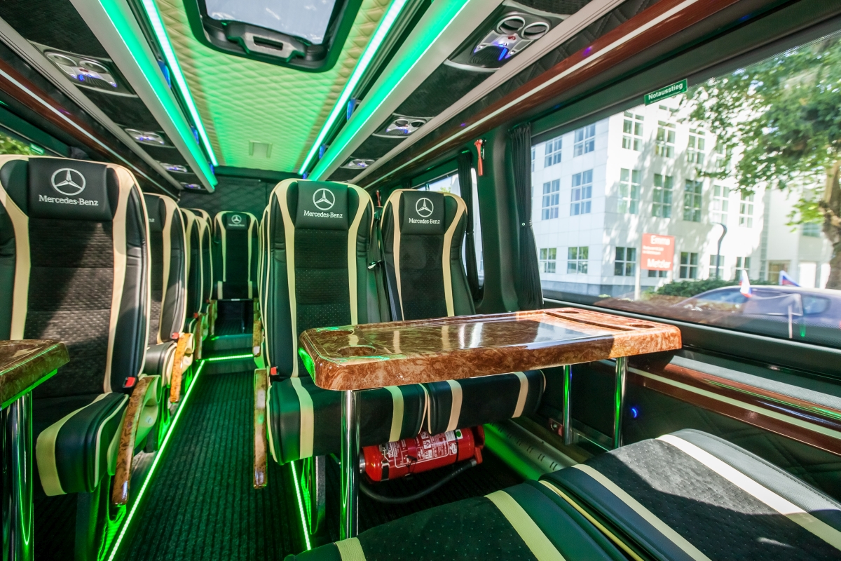 Ein exklusives VIP Fahrzeug mit 19 Sitzplätzen und 2 Konferenztischen für 6 Personen, Küche, Kaffee-Maschine und eigenem Bordkühlschrank.